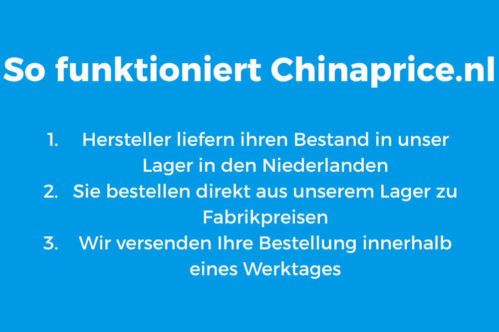 Da wir aus unserem niederländischen Lager versenden, erhalten Sie Ihre Produkte sehr schnell. Profitieren Sie von niedrigen Fabrikpreisen, schneller Lieferung und zuverlässigem Service — alles von einem Anbieter: Chinaprice.nl.