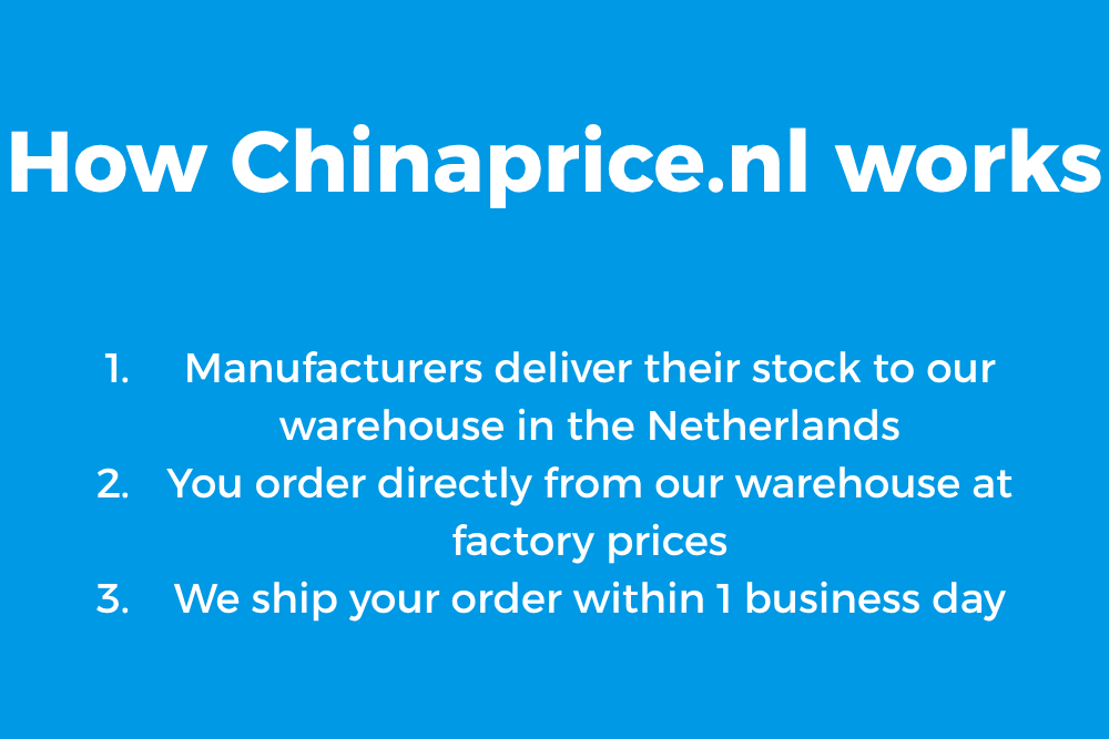 Because we ship all products from our Dutch warehouse, you receive them very quickly. You benefit from low factory prices, fast delivery and reliable service — all from one supplier: Chinaprice.nl.