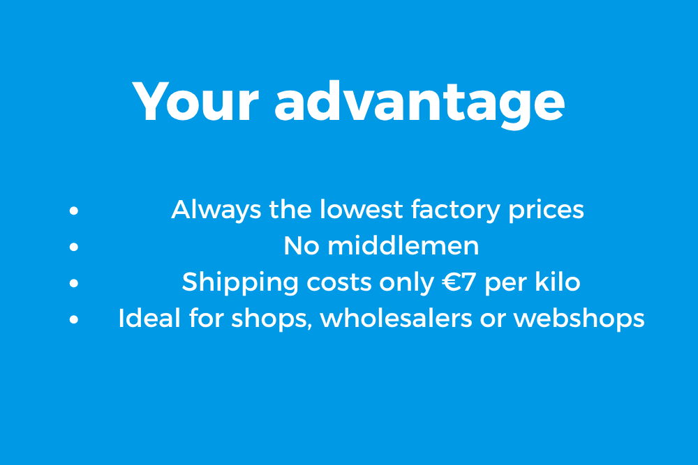 All products are delivered directly from the factory to our warehouse in the Netherlands. This way, you get the best of both worlds: factory purchase prices with the speed and reliability of delivery from the Netherlands. Perfect for entrepreneurs, shops or webshops looking to buy quality products at low prices.